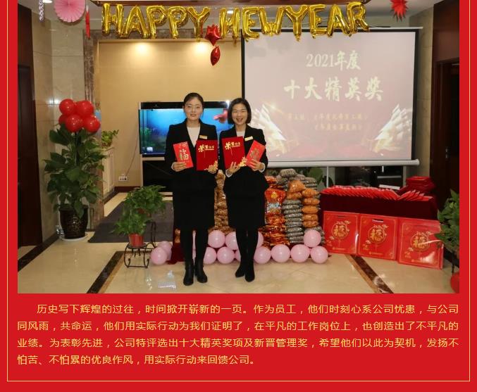2021年終表彰暨福利發(fā)放大會 歲月不居,時節(jié)如流。70多年的光輝歷程和與春秋歲月,書寫了華夏民族的勤勞勇敢,留下了中國人的敬業(yè)拼搏。15年來秦川人秉承敬業(yè)拼搏精神,不懼風(fēng)雨,不斷突破,篳路藍(lán)縷,以啟山林,努力實現(xiàn)著秦川人的夢!過去的一年是努力拼搏的一年,也是我們值得驕傲的一年,通過全體員工的共同協(xié)作,公司的各項工作在逆境中依然取得了較好的成績,每一次的成績凝聚著大家共同的汗水,未來的機(jī)遇和挑戰(zhàn)需要我們繼續(xù)不懈努力去面對。 在取得成績的同時,我們也要學(xué)會感恩。感恩是一種美德,是一種態(tài)度,一個懂得感恩的人,才能成就他生命的事業(yè)高度。首先,我們要感恩我們的國家,我們國家的各項政策使得我們國富民強(qiáng),作為企業(yè),我們要積極響應(yīng)國家各項政策,樹立堅定的民族精神和信仰,用這種強(qiáng)大的精神信仰去描繪祖國未來的宏圖,將我們的一片丹心和滿腔熱血獻(xiàn)給祖國,用自己的智慧為祖國的建設(shè)奉獻(xiàn)自己的力量。其次,我們要感恩員工,一個企業(yè)的發(fā)展興衰,靠的是每一位員工高度的執(zhí)行力、忠誠度和感恩的情懷,感恩意味著和公司同舟共濟(jì)。如果企業(yè)是一條船,那我們就是一雙雙手,只有我們共同伸出雙手,讓千萬支雙手一起使勁,我們的航船才能劈波斬浪,勇往直前。 2021年我們有太多的故事和感動,2022年我們又有更多的期望和夢想。夢想的畫卷正徐徐展開,讓我們用今天的奮斗,成就明天的光榮,不忘初心再出發(fā),牢記使命勇?lián)?dāng),奮力拼搏,續(xù)寫光輝。最后祝愿我們的祖國繁榮富強(qiáng),我們的中華兒女安居樂業(yè),我們的事業(yè)蒸蒸日上,我們的公司前程似錦!